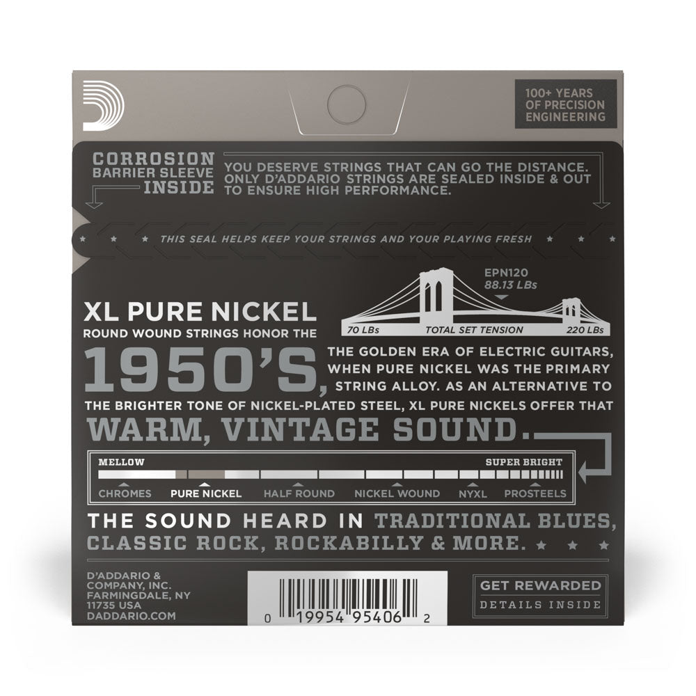 A Pure Nickel é uma corda de sonoridade vintage, que retoma o som típico dos anos 50 e 60. Assim como as utilizadas na época são feitas com liga de níquel, o que possibilita um timbre mais claro e brilhante e um aumento das propriedades magnéticas da corda. As Pure Nickel produzem um som quente e sem estridência, essencial para gêneros como blues, classic rock e rockabily.